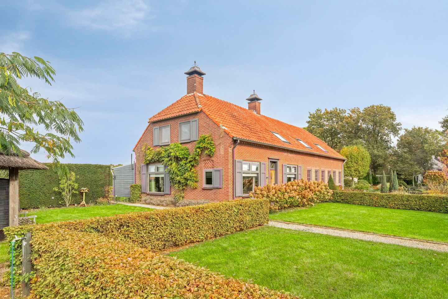 Rondom de woning ligt een fraai aangelegde tuin met gazon, hagen en volwassen beplanting. Aan de achterzijde bevindt zich een groot erf met een ruime schuur/werkplaats (ca. 10 x 10 meter, totaal ca. 100 m²) met bergzolder, overkapping en houtopslag.