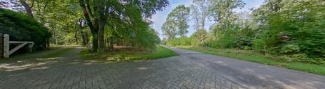 De lommerrijke en kronkelende oprijlaan met aan weerszijden Rhododendrons geeft toegang tot de woning en centrale parkeer- en manoeuvreerplaats. Aan de linkerzijde is een riante overkapping / carport gerealiseerd met daaraan vast de berging / garage met vliering. De hoofdzakelijk uit gazon bestaande zijtuin is v.v. houten bergingen / overkappingen en de 55 m² grote kas. Vanuit daar begint het pad door het bos. Het bos omringd het gehele perceel met in het midden, aansluitend aan de woning een riant gazon. Aan het einde van het gazon ligt het grote ven en staat de houten hut. Direct aan de woning is een terras met vrij uitzicht over het eindeloze gazon en aan het eind het ven.