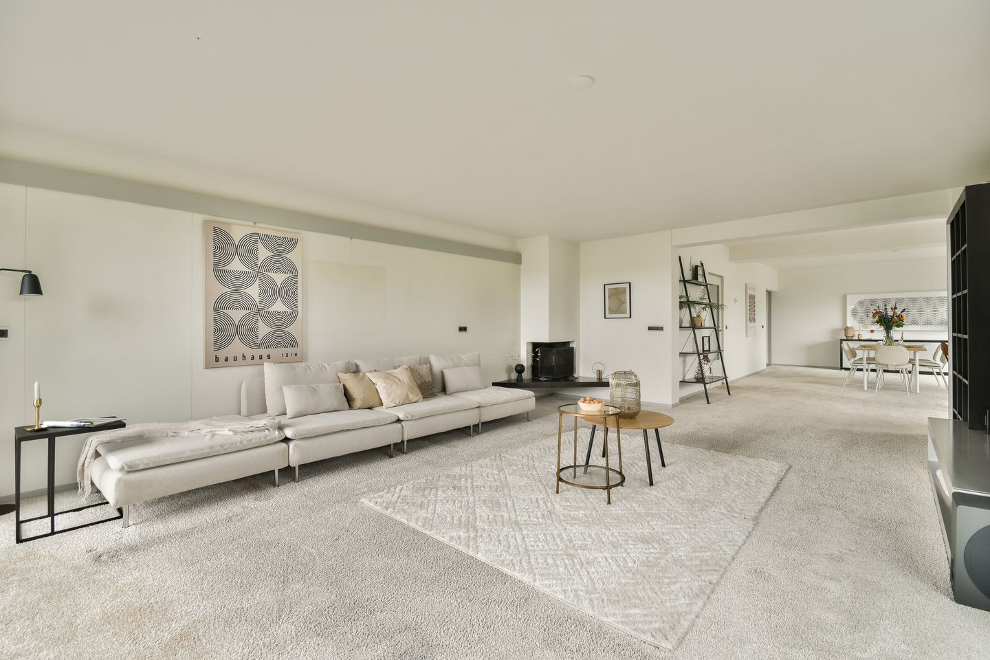 The kitchen (Poggenpohl) with generous cabinet and counter space and built-in appliances, leads to the dining room and adjacent living room with a total surface of approx. 70 m². The living room features a fireplace and large aluminum window frames (2022) with HR++ glazing, bringing in plenty of natural light. From the dining room, sliding doors open onto the terrace and garden.