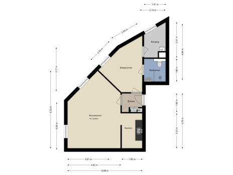 Vanuit de centrale hal bereik je via de trap of de lift de tweede verdieping. Via een lange gang bereik je het appartement. Bij binnenkomst kom je in een hal/entree. Vanuit de hal zijn de woonkamer én de slaapkamer bereikbaar. Via de slaapkamer heb je toegang tot de badkamer en de berging / technische ruimte (CV ketel en wasmachine aansluiting). De badkamer beschikt over een douche, wastafel en toilet. De hal open keuken, bereikbaar vanuit de woonkamer, is basis afgewerkt.