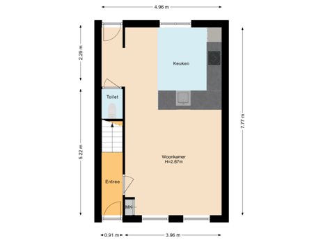 Entree/hal, trapopgang, woonkamer met open witte keuken met lichtgrijs aanrechtblad, koelkast, combi-oven, inductiekookplaat, afzuigkap, diverse laden en spoelbak. Verder bevinden zich hier ook de meterkast en de toiletruimte. De achtertuin is bereikbaar via de achterdeur.
