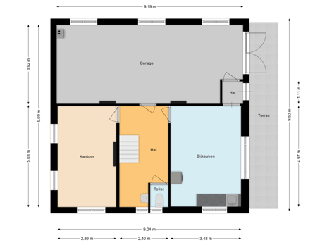 De kamer (14,4 m2) aan de voorzijde kan gebruikt worden als kantoor, werkkamer of studeer- of speelkamer en is eveneens bereikbaar vanuit de hal.