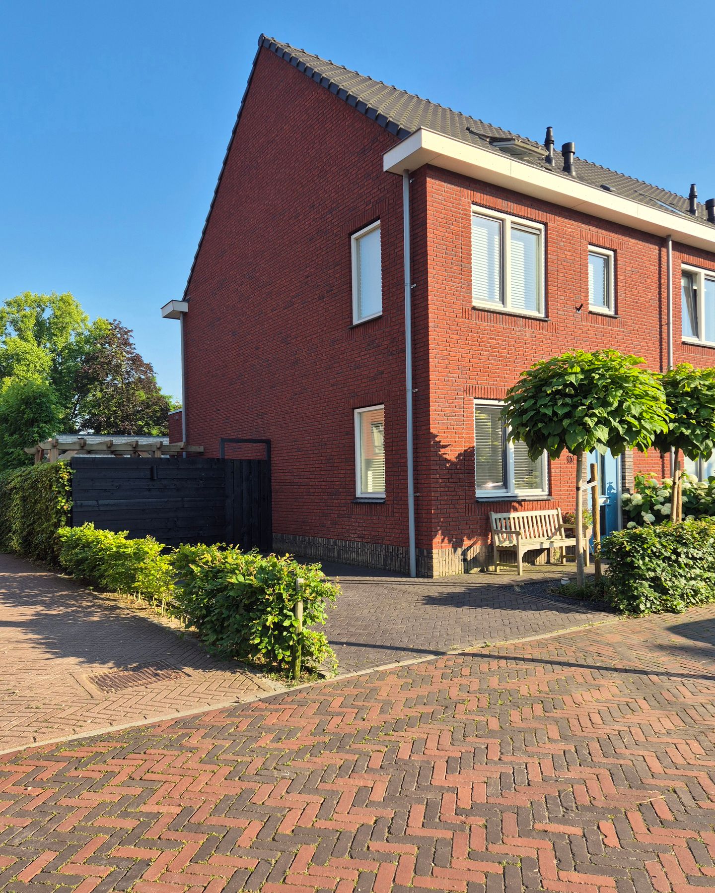 Buiten: Bestrate oprit naast de woning. Voortuin met siergrind en beplante border. De, op het zuidoosten gesitueerde, achtertuin is geheel omsloten door tuinschermen en groenblijvende haag, waardoor deze veel privacy biedt. De ruime, zonnige tuin heeft twee bestrate terrassen, gazon, beplante border, vrijstaande houten berging, achterom en poort naar oprit. Voor- en achtertuin zijn voorzien van een intelligent tuinverlichtingsysteem. Aan de achtergevel bevindt zich een zonnescherm ter breedte van het hoofdterras.