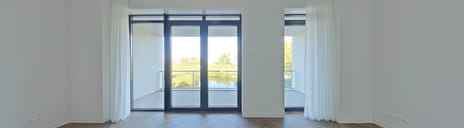 die toegang geven tot het balkon. Vanuit hier kijk je over groen en het IJmeer, een uitzicht dat nooit verveelt. Dankzij de hoge plafonds en grote raampartijen voelt elke hoek ruim en
