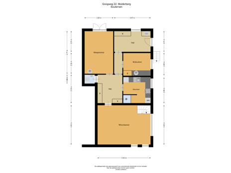 Het souterrain is bereikbaar vanuit de zijkant van de woning, maar de mogelijkheid bestaat om het souterrain weer bereikbaar te maken vanuit de woonkamer op de begane grond; de trap hiervoor is nog aanwezig. De entree/hal heeft vaste kasten en u bereikt als eerst de bijkeuken en de tweede hal. Deze hal geeft toegang tot het toilet, de ruime slaapkamer met openslaande deuren naar het terras, de keuken met ook de aansluiting voor wasmachine en droger en de douchehoek en tot de woonkamer (met de afgesloten trap waar weer een verbinding gemaakt kan worden met de woonkamer op de begane grond).