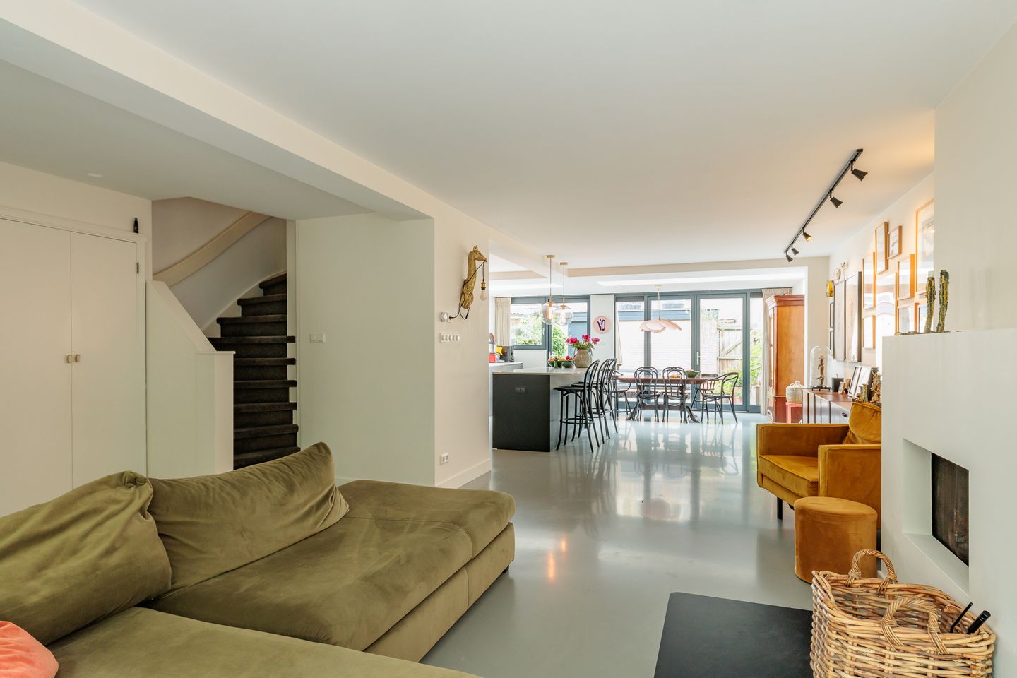 You enter via a generous hallway with a modern guest toilet and immediately experience the wow factor of this home: what a beautiful space, what natural light, and what a stunning kitchen with island and bar. The open layout, large skylight, double doors to the garden, and thoughtful design create an impressive whole where every detail fits.