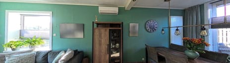 In de woonkamer ligt een plavuizenvloer voorzien van vloerverwarming en er is voldoende ruimte voor een gezellige zit- en eethoek. In het midden van de woonkamer situeert een houten balk voorzien van lichtspots. Ook is er een airconditioning aanwezig.