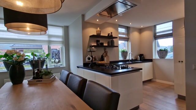 Via de overdekte entree betreed je de hal met toilet, meterkast en trapopgang. Aan de voorzijde bevindt zich de luxe keuken, uitgevoerd met hoogwaardige inbouwapparatuur zoals een gaskookplaat, oven, vaatwasser en koel-vriescombinatie. De ruime woonkamer is voorzien van een strakke vloerafwerking met vloerverwarming, veel daglicht en openslaande deuren naar de tuin, waardoor binnen en buiten mooi met elkaar verbonden zijn.