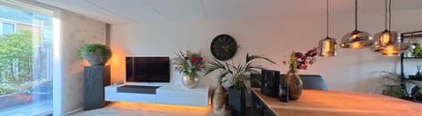 De ruime woonkamer is voorzien van een pvc-vloer en kenmerkt zich door een prettige lichtinval dankzij de glazen pui aan de achterzijde met openslaande deuren naar de tuin. Daarnaast beschikt de woonkamer over een praktische trapkast. Aan de achterzijde bevindt zich de eethoek, die grenst aan de open keuken.