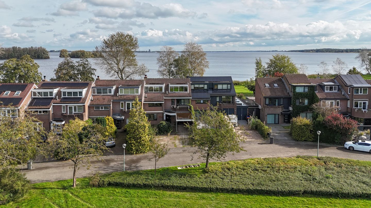 Garage, carport, en tuin: aan de voorzijde is een oprit, een carport met aansluitend een inpandige garage. Aan de voorzijde is een ruime tuin aanwezig. De achtertuin grenst direct aan een voetpad die vervolgens overgaat in de oevers van het Gooimeer.