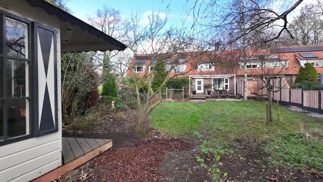 De woning staat op een ruime kavel van ongeveer 595 m², waarvan de voortuin zonnig is gelegen op het zuidwesten. De tuin is omgeven door bomen die zorgen voor beschutting en privacy. Aan de voorzijde van de woning is een verstelbare zonwering, die zowel horizontaal als verticaal kan worden ingesteld, waardoor je altijd de gewenste schaduw kunt creëren. Daarnaast staat er een gezellig houten chalet in de tuin, perfect voor opslag of als tuinhuisje.
