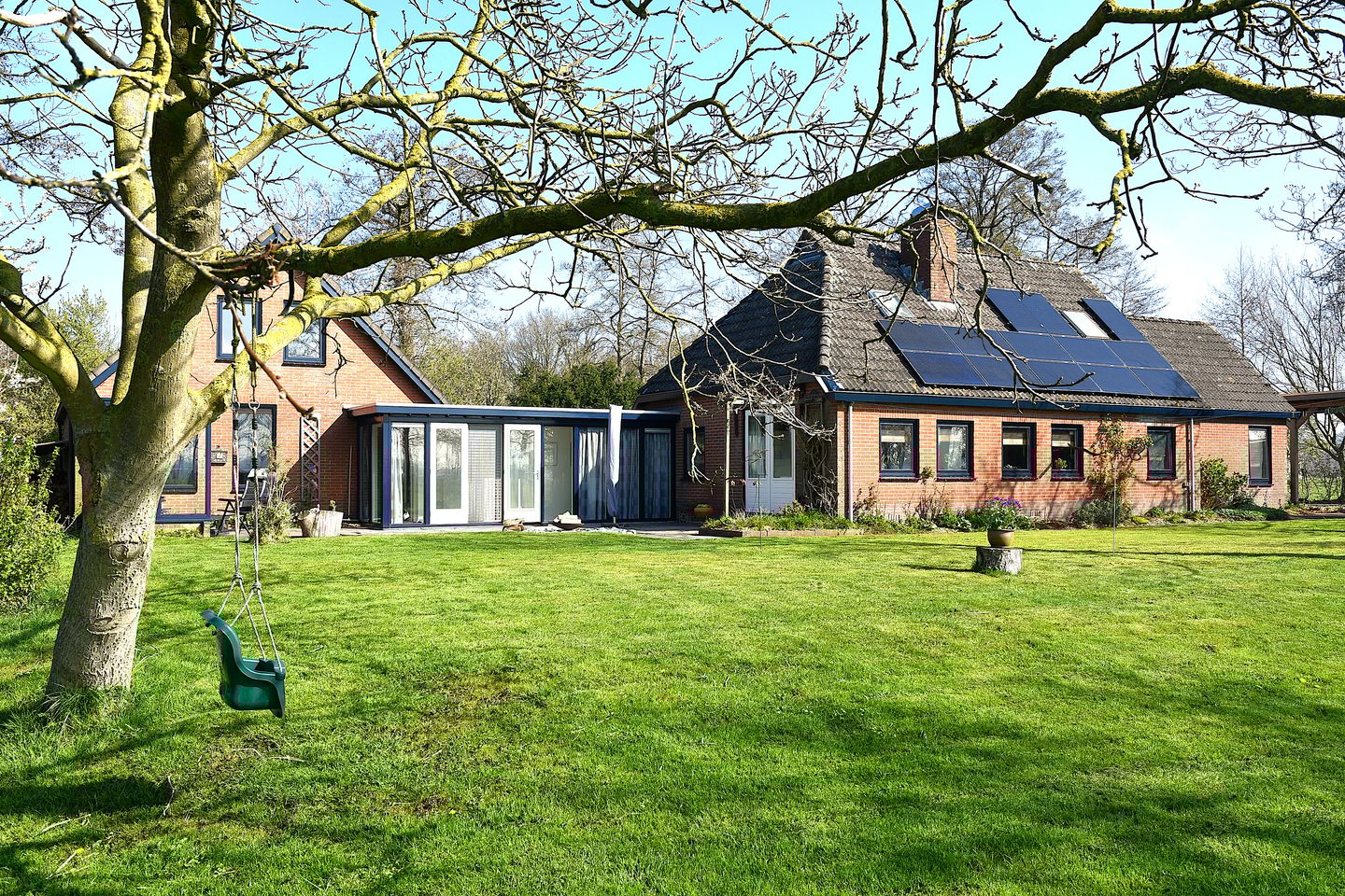 Recentelijk zijn de woonboerderij en bijgebouw door een ‘glazen gang’ met elkaar verbonden. ‘Apart en toch samen’: wat wil je nog meer?