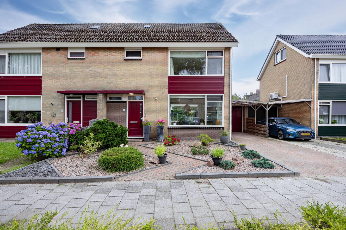 Naast de garage is er een praktische tuinschuur aanwezig. Via het achtergelegen voetpad is een achterom eenvoudig te realiseren. De voortuin en oprit maken het geheel compleet: parkeren op eigen terrein kan met twee auto’s.