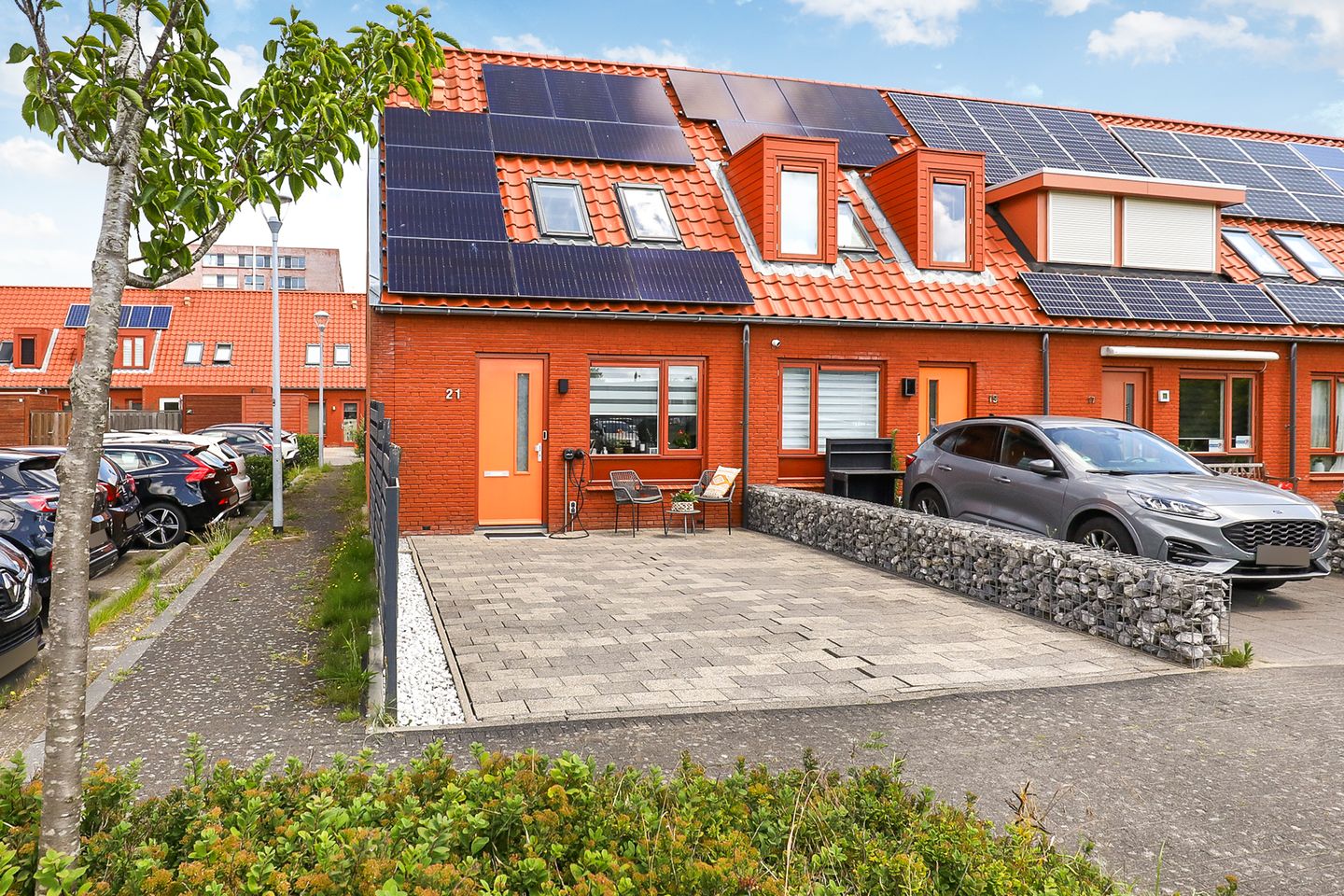Buiten: in de voortuin is een mogelijkheid voor het parkeren van een auto met een laadpaal. De achtertuin op het noordoosten is voorzien van een terras, een houten berging en een achterom.