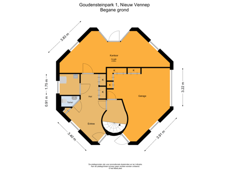 Via de fraai aangelegde voortuin bereikt u de entree van de woning. U komt binnen in een ruime hal met meterkast en een modern toilet, wasruimte en grote kantoorruimte. Vanuit de hal is ook de inpandige ruime garage toegankelijk. De garage heeft een ingebouwde kasten en is voorzien van een elektrisch te bedienen garagedeur.