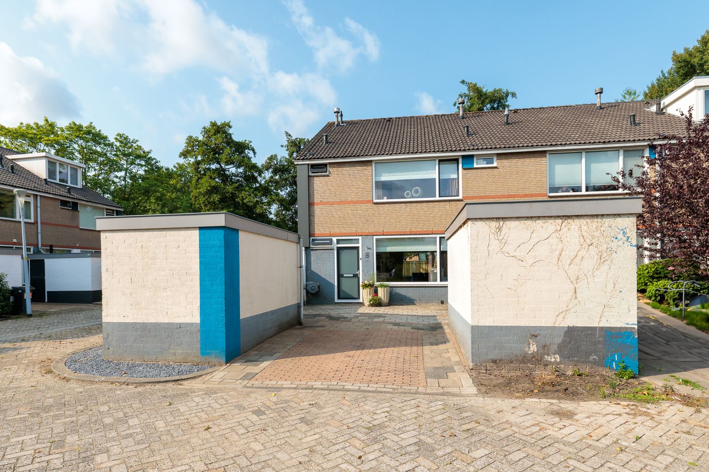 Buiten: er is een voortuin met een parkeerplaats op eigen terrein en een aangebouwde stenen (fietsen)berging. De achtertuin op het zuidwesten is voorzien van een terras, gras, een nieuwe schutting en achterom. Achter de tuin ligt een park met diverse speeltuintjes.