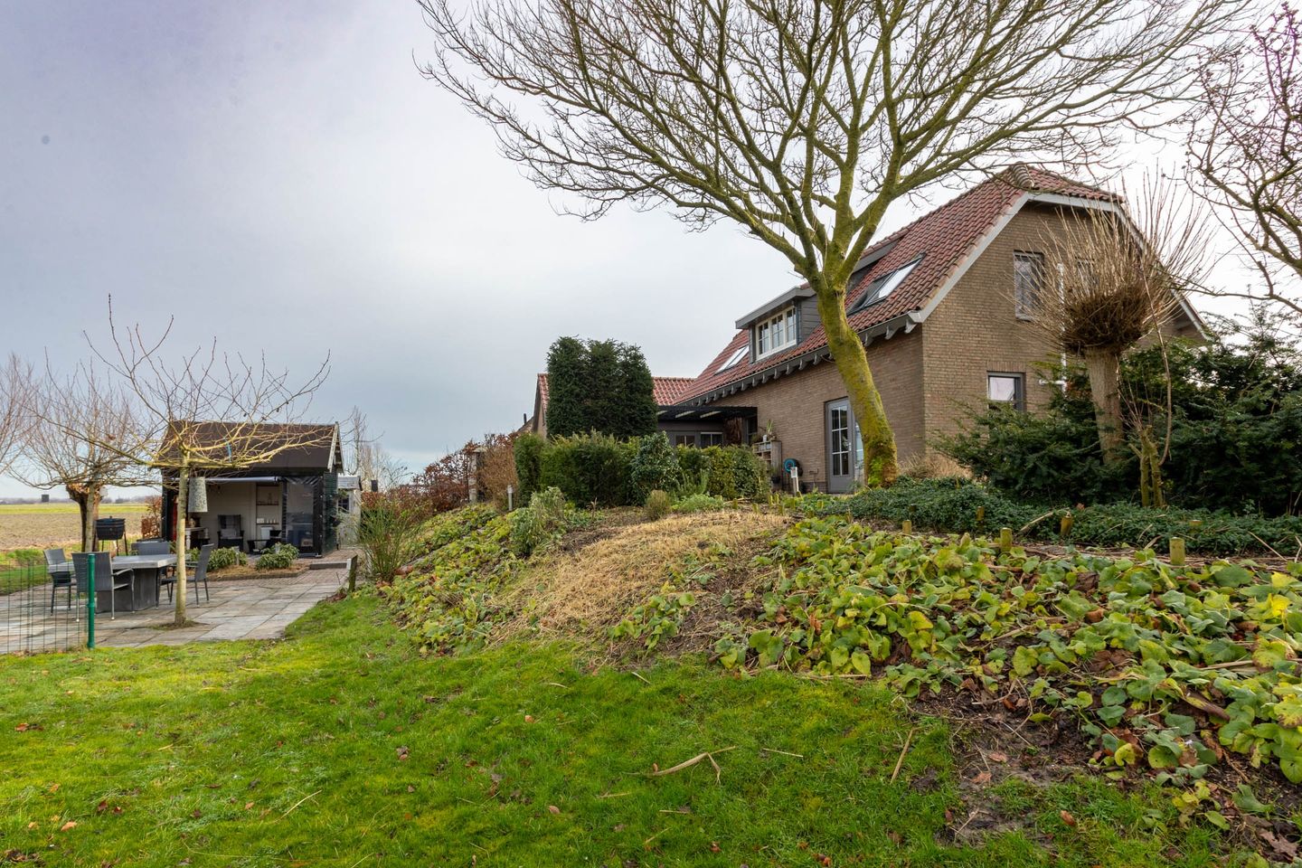 De fraai aangelegde tuin, compleet met fruitbomen, terrassen en een overkapping, maakt het plaatje compleet. Het is (zeker in de zomer) werkelijk een paradijs! Hier woon je écht vrij, midden in het groen, met alle gemakken van nu.