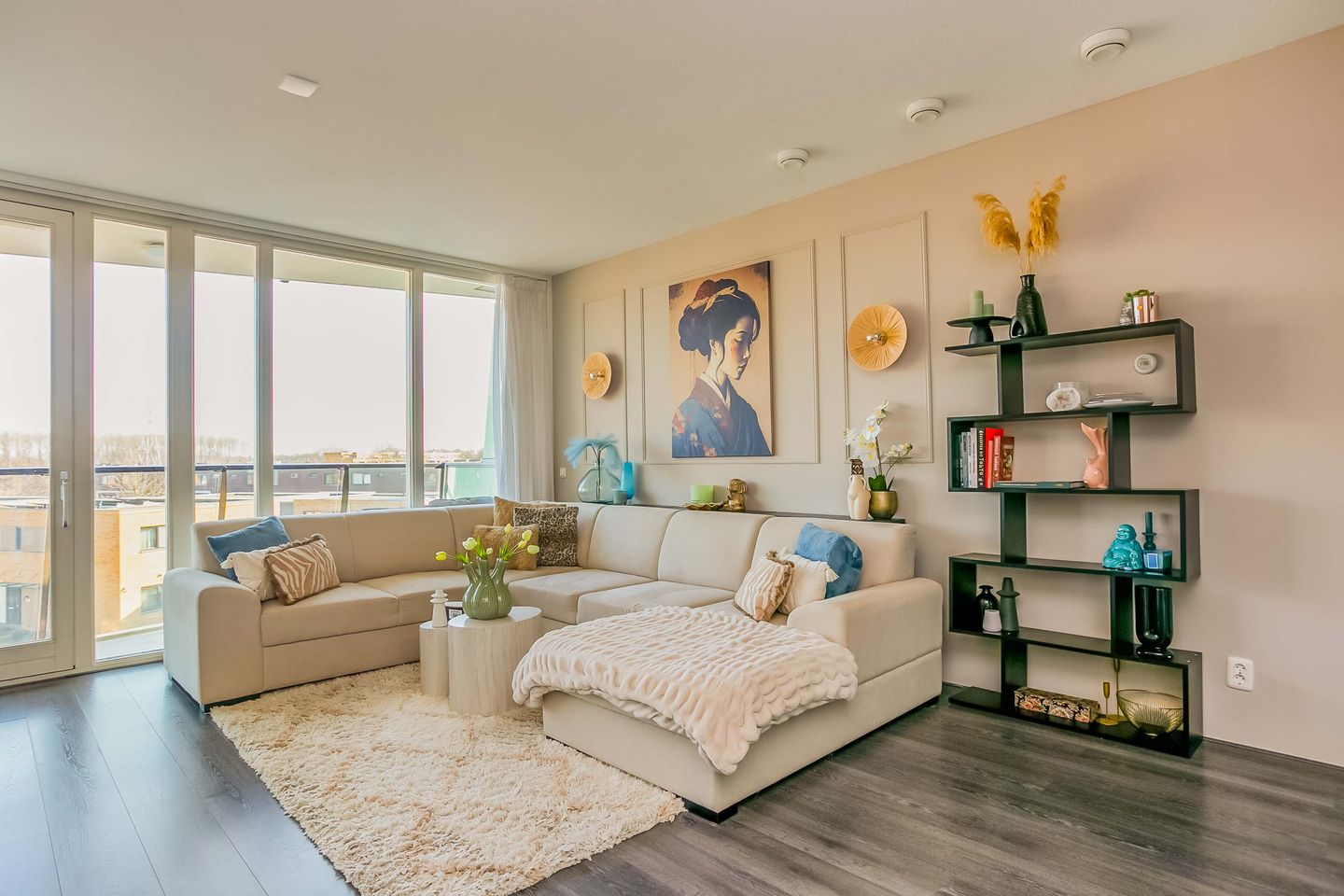 Net als de slaapkamer beschikt ook de woonkamer over grote raampartijen, waardoor er veel natuurlijk daglicht de ruimte binnenkomt. Er is hier ruimte voor zowel een zit- als eethoek. De hoogglans witte keuken beschikt over een kookplaat, afzuigkap, koelkast, vriezer, combi-oven en een vaatwasser. Het gehele appartement is voorzien van een nette laminaatvloer, glad gestucte wanden en een keurige en moderne afwerking.