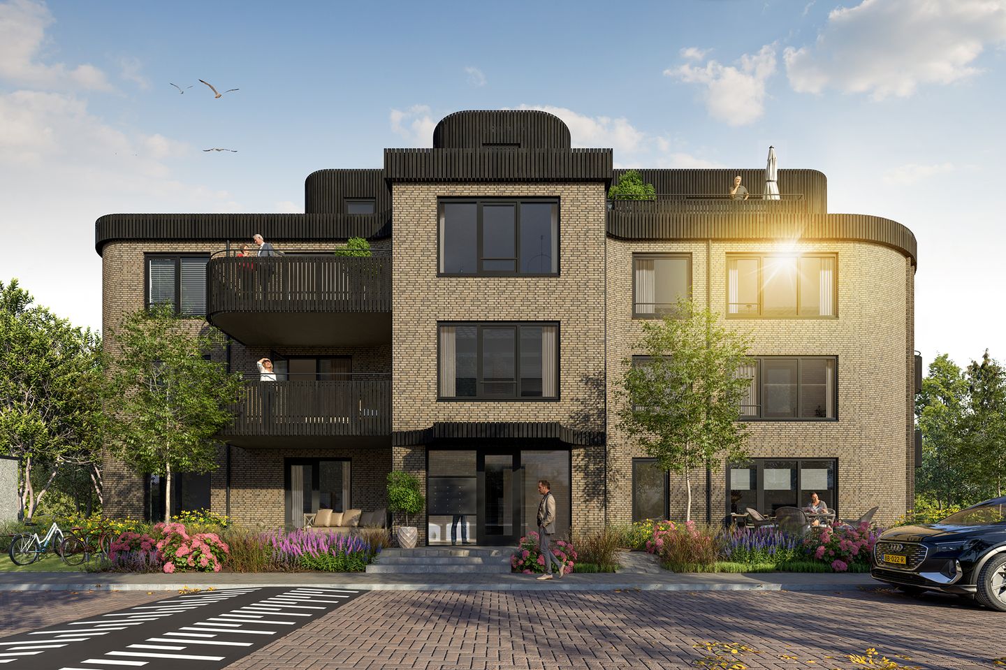 Alle woningen beschikken over extra ruime balkons of terrassen en parkeren gebeurt comfortabel op eigen terrein in een afgesloten stallingsgarage, waardoor auto’s uit het zicht blijven. Hier bevindt zich ook de gemeenschappelijke fietsenberging die direct gekoppeld is aan de centrale entree aan de Edisonbaan. De begane grond telt twee appartementen met een eigen buitenruimte in de gezamenlijke tuin; op de eerste en tweede verdieping liggen telkens vijf royale appartementen.