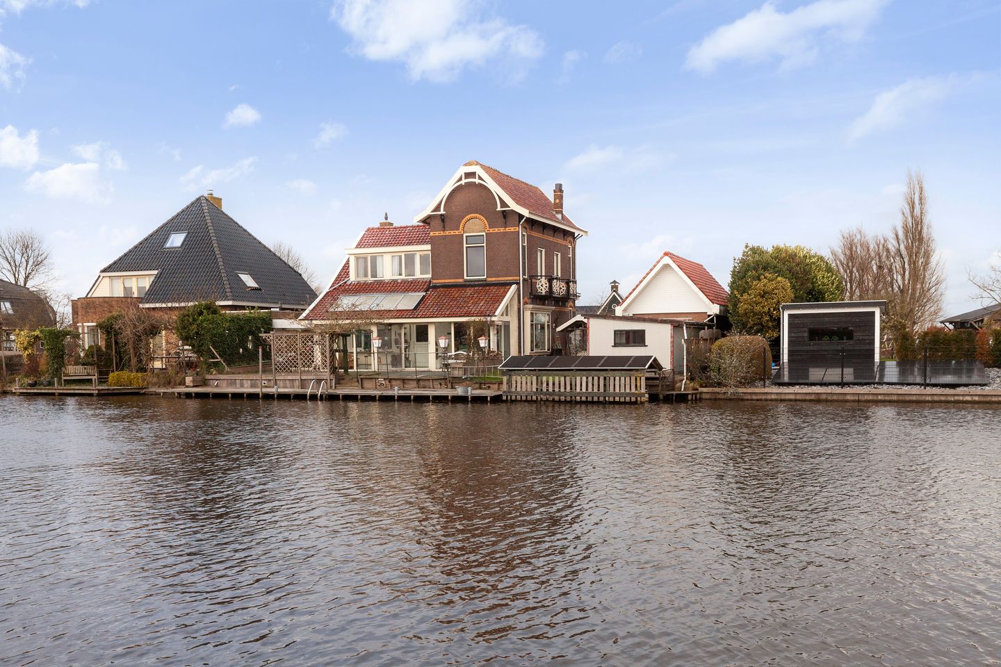 Aan de achterzijde bevindt zich sierstraatwerk, groen en enig houtwerk. In het water is er een grote houten sterk verouderde steiger en botenhuis aanwezig.