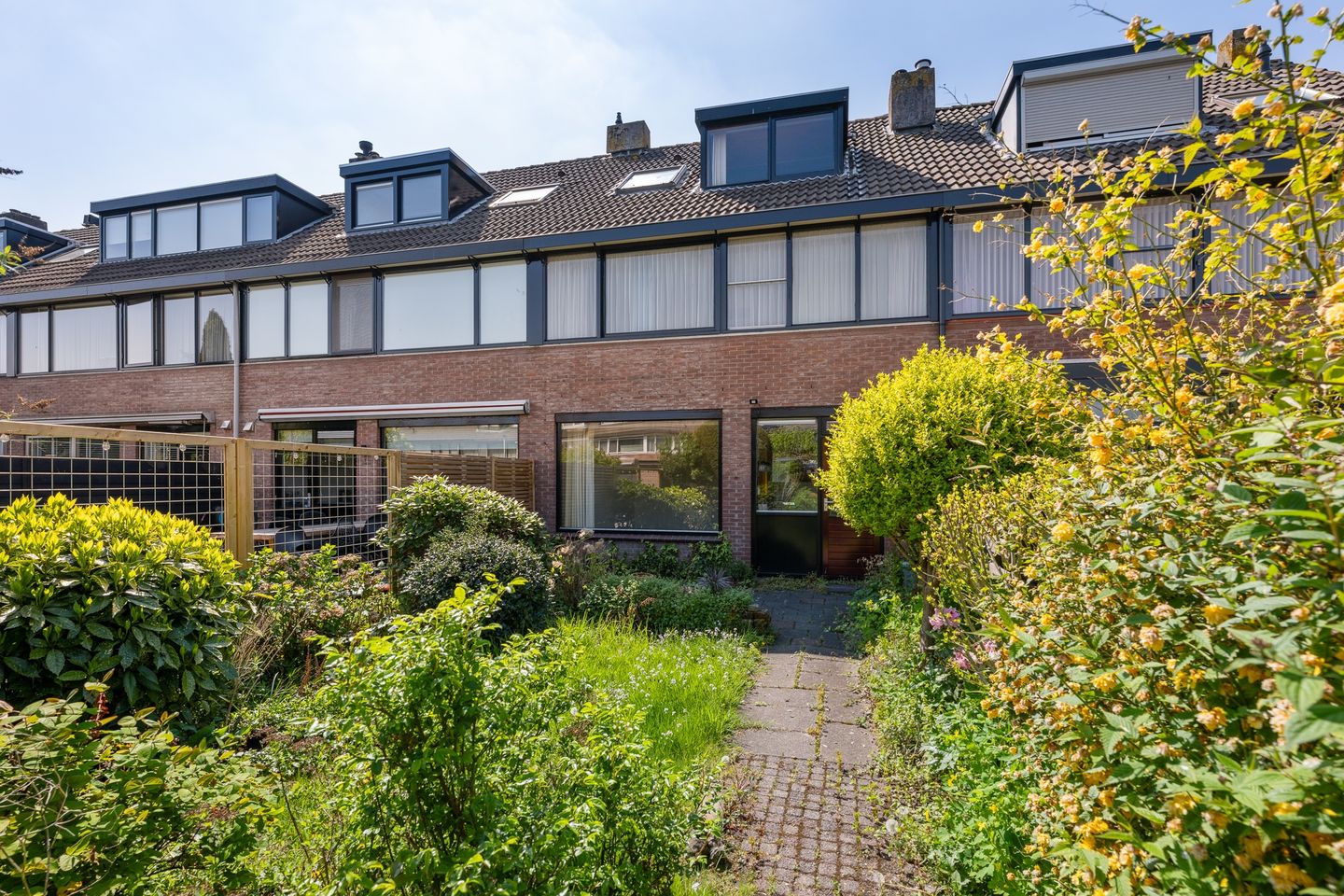 In de lange achtertuin, kun je op verschillende plekjes vrijwel de hele dag van de zon genieten. De tuin is nu ingericht met een gazon en gevarieerde beplanting.