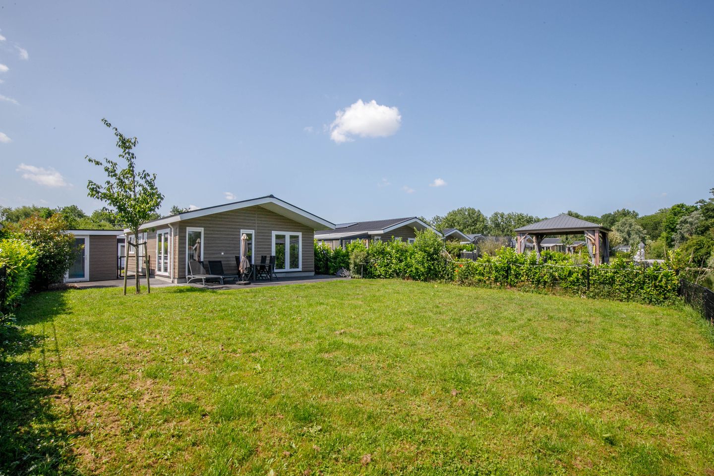 Wat betreft de constructie van de woning, rust deze op stevige schroefpalen met een solide betonplex ondervloer, terwijl een dompelpomp onder de bungalow zorgt voor een efficiënte afvoer van grond- en regenwater, waardoor u zich geen zorgen hoeft te maken over vochtproblemen.