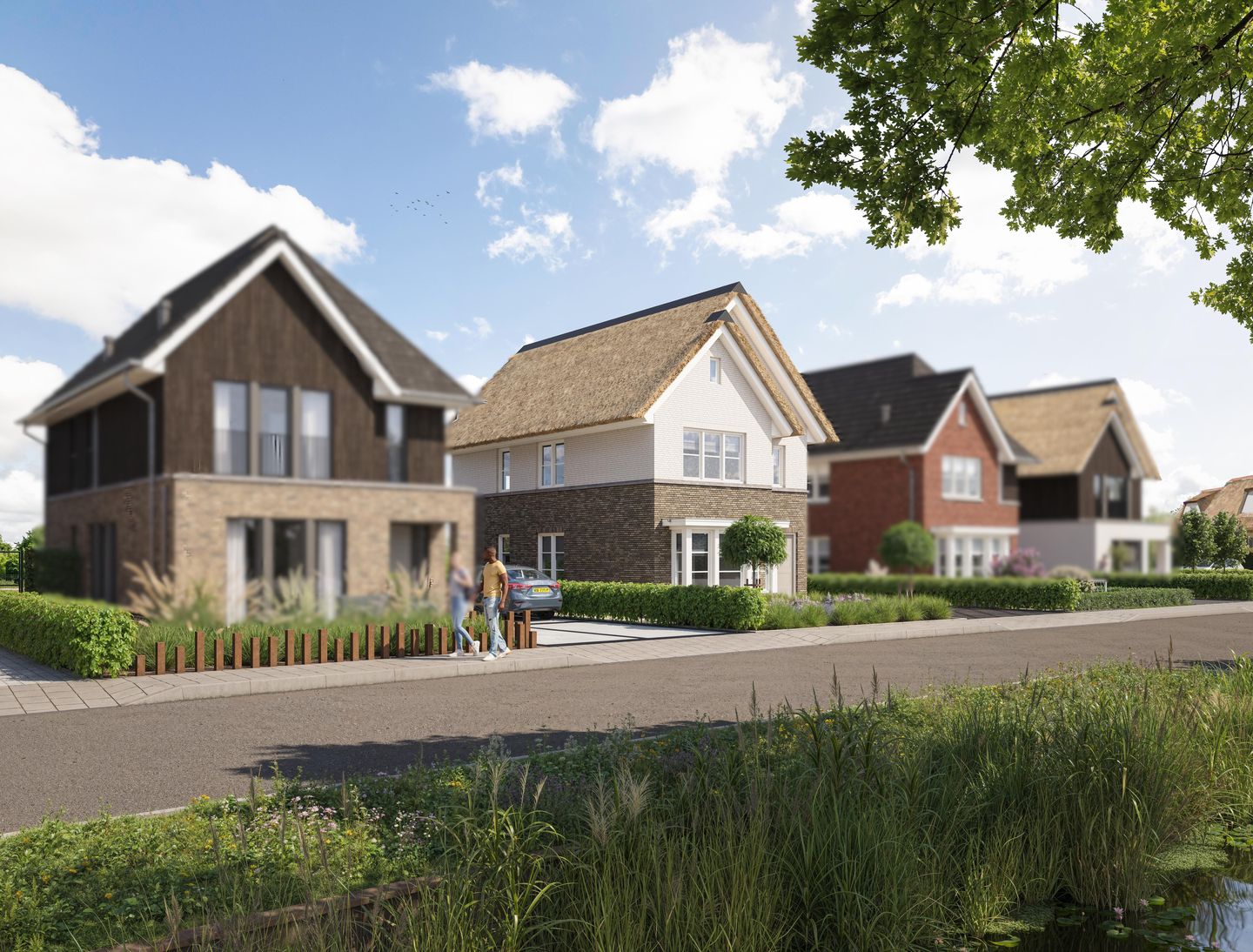 Deze fraaie vrijstaande villa type Bosdam beschikt over een landelijke architectuur met een lichte gevelsteen en karakteristieke rieten kap. De ruime living bestaat uit een grote woonkamer en gezellige woonkeuken, de keuze waar u welke ruimte wilt maken is volledig aan u. Grote raampartijen laten het zonlicht rijkelijk binnen en de openslaande deuren bieden een directe toegang tot de tuin. De fraai vormgegeven erker aan de voorzijde zorgt voor extra woonoppervlak en nog meer lichtinval in de woonkamer of keuken.