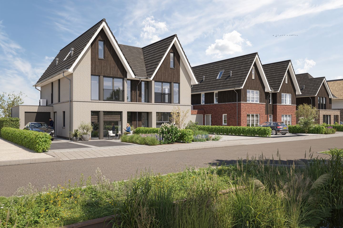 De geschakelde villa’s van type Verlooij hebben een moderne en strakke uitstraling door het gebruik van een lichte gevelsteen die wordt afgewisseld met donkere houten geveldelen. De fraai vormgegeven voorgevel zorgt met haar grote raampartijen voor veel lichtinval in de woonkamer en keuken. In de voortuin biedt de grote oprit ruimte voor meerdere parkeerplaatsen.