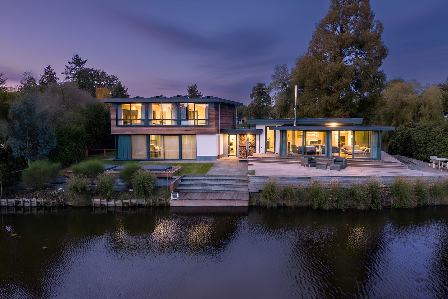 De villa (oorspronkelijk in 1972 gebouwd) is in 2009, naar ontwerp van architect Kappelhoff, volledig getransformeerd tot een moderne en stijlvolle woning. Met een doordachte combinatie van renovatie, heropbouw en een forse uitbreiding is een harmonieus geheel ontstaan dat zich naadloos voegt in zijn groene omgeving. De hoogwaardige afwerking, de grote raampartijen en de speelse lijnen van het ontwerp zorgen voor een overvloed aan licht en een panoramisch uitzicht over het water en het omringende groen. Binnen en buiten vloeien op natuurlijke wijze in elkaar over op dit royale perceel dat volop privacy biedt. Natuurliefhebbers kunnen hier hun hart ophalen: eenden, ijsvogels, spechten, merels en een grote variatie aan planten en bomen maken deel uit van het dagelijks uitzicht. De imposante, 50 jaar oude rododendron in volle bloei in het voorjaar is letterlijk het roze hoogtepunt van het jaar.