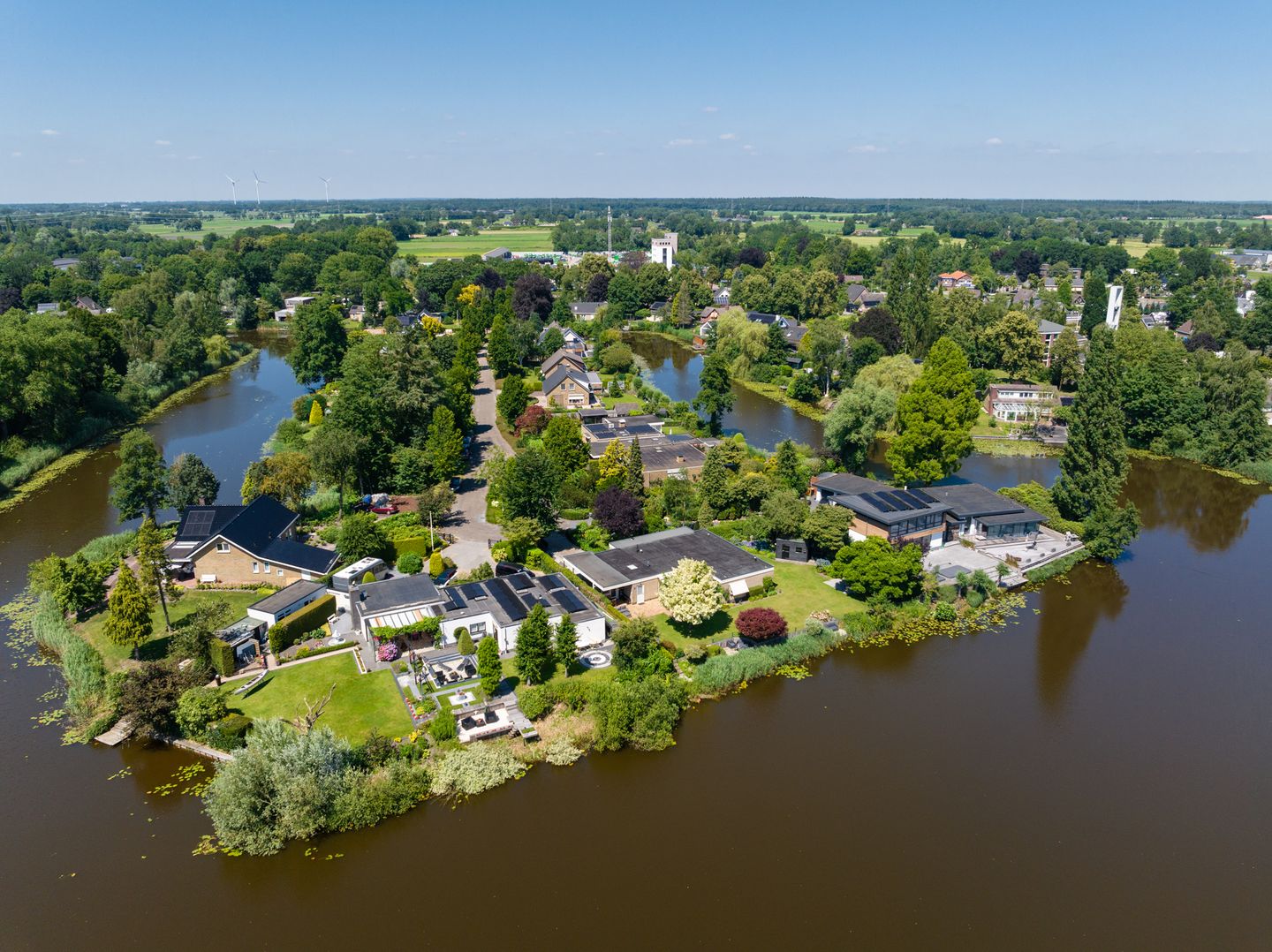 Gelegen op een landtong, omgeven door veel groen, biedt de bungalow volop privacy en rust, terwijl voorzieningen toch dichtbij zijn.