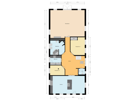 Entree/hal met trapopgang; toilet; ruime woonkeuken met kookeiland; slaapkamer I; badkamer; bijkeuken; slaapkamer II; woonkamer met openslaande tuindeuren.