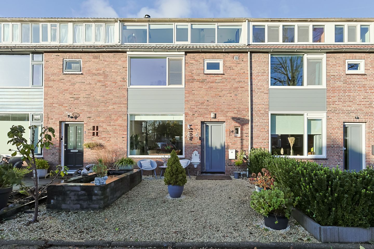 De voortuin is onderhoudsarm aangelegd en heerlijk zonnig.