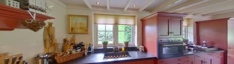 Wanneer u vanuit de hal doorloopt naar de woonkeuken, wordt u verwelkomd door een ruimte die sfeer ademt. Van de stijlvolle leistenen vloer, de open haard en de serre tot aan de zichtbare balkenstructuur: alles ademt sfeer. Door de natuurlijke lichtinval voelt de ruimte écht groot aan.