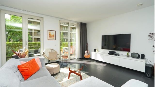 Entree met royale hal, toiletruimte met wandcloset en fonteintje, meterkast, trap naar de verdieping en een trapkast. De lichte woonkamer heeft dubbele openslaande deuren naar jouw eigen terras. Deze is aangesloten bij de sfeervolle binnentuin die alleen toegankelijk is voor bewoners. In de woonkamer is tevens de luxe keuken gesitueerd. De keuken is voorzien van alle gemakken. Zo heb je veel opbergruimte in de wandkast voorzien van een combi-oven met stoomfunctie, koffiezetapparaat, vaatwasser en een koel- vriescombinatie. Het eiland is voorzien van een inductiekookplaat, spoelbak met combikraan én een bar waar je met 4 personen kan borrelen of eten. De afzuigingsinstallatie is aan het plafond gevestigd en voorzien van sfeervolle spots en een LED strip.