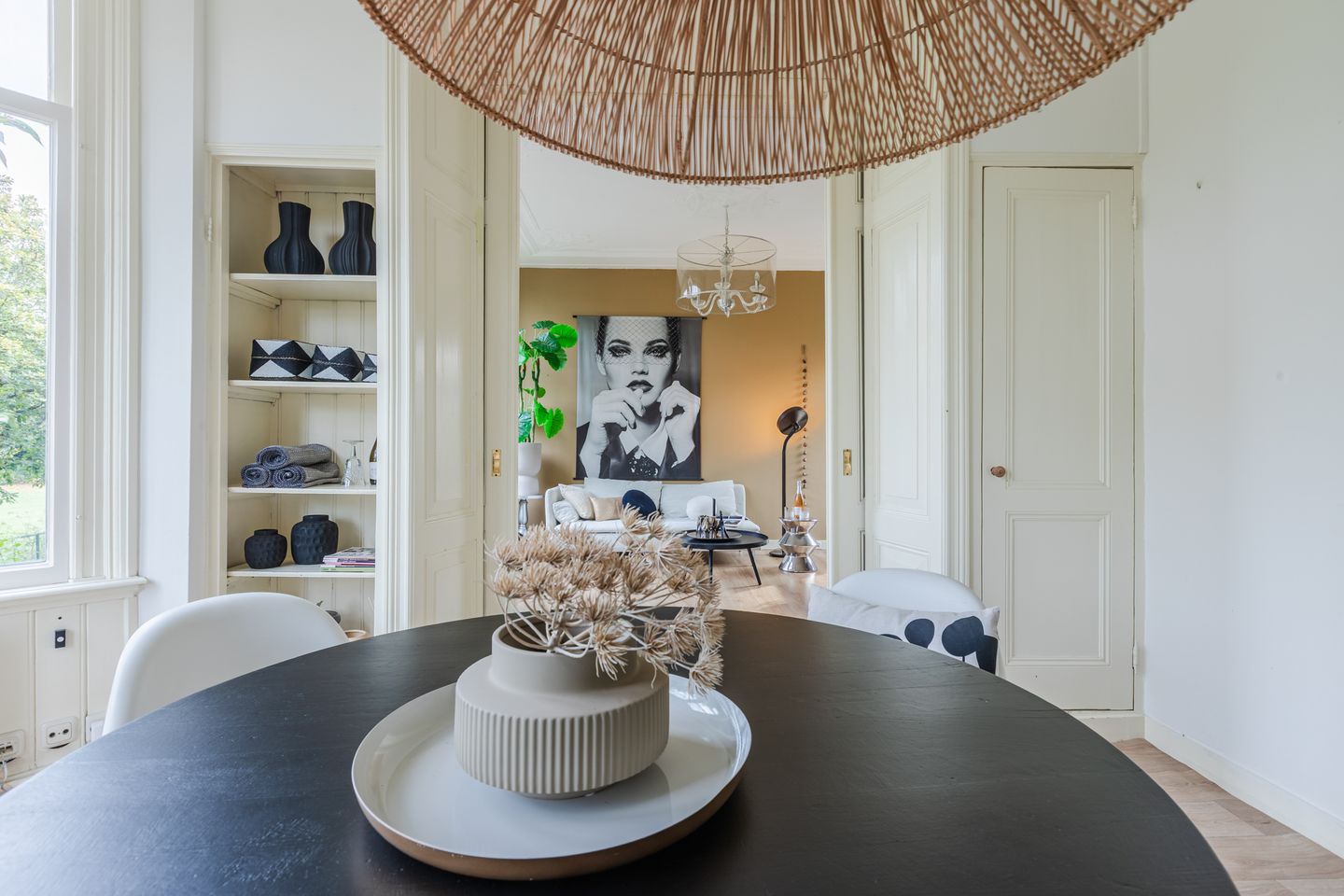 Zeer royale en lichte woon/eetkamer met erker, hoge plafonds met sierornamenten en de originele en-suite deuren. Omdat de woning over de breedte is gebouwd krijg je hier een zeer positieve verrassende eerste indruk. Door de grote raampartijen is er niet alleen veel licht, maar heb je ook ruim uitzicht over een tegenovergelegen park.