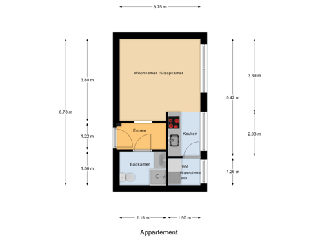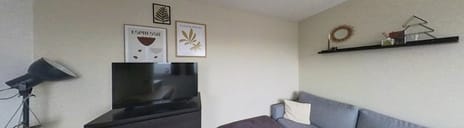 Efficiënt ingedeeld, lichte woon-/slaapkamer.