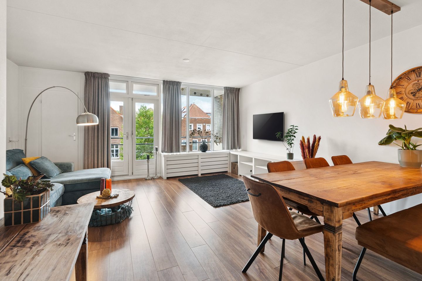 De woonkamer vormt het hart van dit appartement, met een ruime zithoek en een gezellige eethoek die aansluit op de keuken. Grote ramen en openslaande deuren laten veel daglicht binnen en bieden uitzicht op de sfeervolle straat. De warme houtlook vloer en het rustige kleurgebruik zorgen voor een neutrale basis die bij uiteenlopende interieurstijlen past.