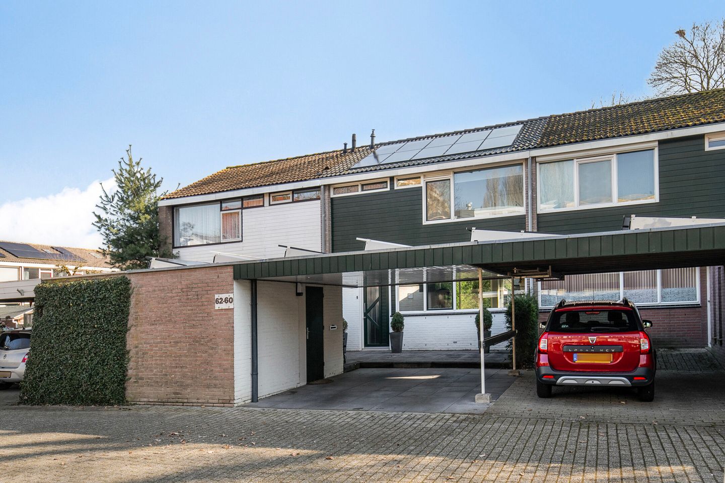 Aan de voorzijde van de woning parkeert u uw auto op eigen terrein onder de carport, die is voorzien van ingebouwde spots. Het platte dak van de carport is in 2018 vervangen, aansluitend treft u hier de stenen berging.