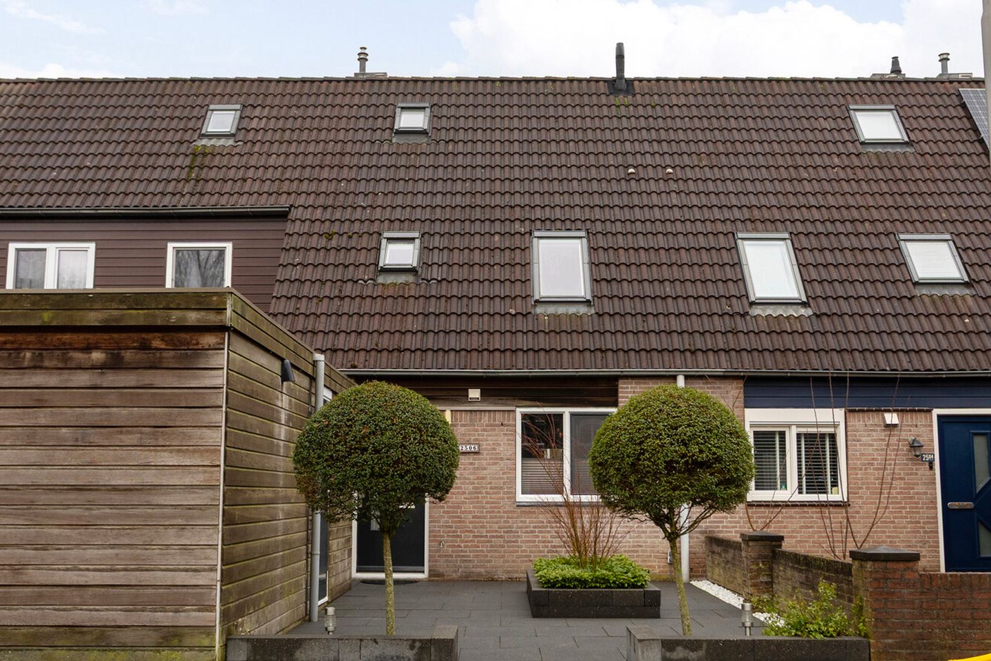 Achtertuin met zonnescherm en achterom.