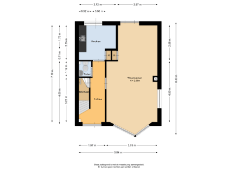 entree, hal met gecombineerde kelder-/meterkast, verzorgd toilet, ruime woonkamer met erker, dichte keuken met keukenopstelling en deur naar de achtertuin.