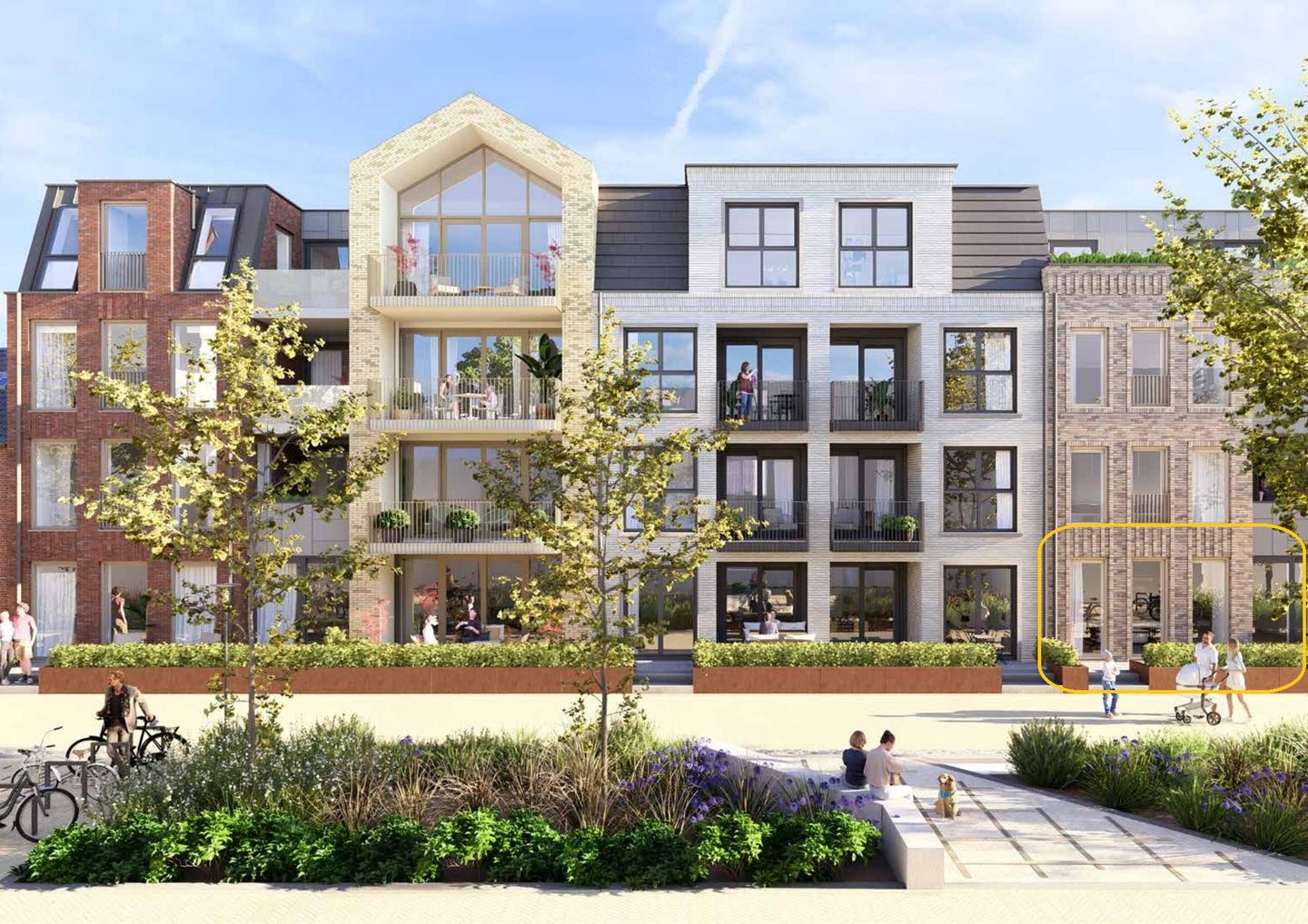 Hierdoor wordt een plezierige overgang tussen privé- en gemeenschappelijk gebied gecreëerd. De overgang wordt ter plaatse van de hoofdentrees uiteraard zonder trappen overbrugd.