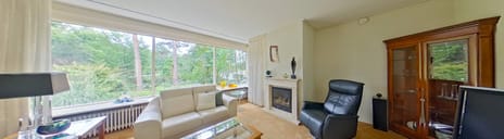 De woonkeuken met diverse inbouwapparatuur biedt een fantastisch vrij uitzicht over de tuin en het groen. Vanuit de keuken is er een directe verbinding met de royale, tuingerichte living met sfeervolle gashaard. De aangrenzende serre met schuifpui naar het terras vormt een heerlijke plek om binnen en buiten met elkaar te verbinden. Via de gang zijn bereikbaar: het toilet met fontein, een slaapkamer met vaste kastenwand, een tweede slaapkamer met kasten en een fitnessruimte, die ook uitstekend te gebruiken is als kantoor of atelier. De moderne badkamer is voorzien van een inloopdouche en design wastafelmeubel.