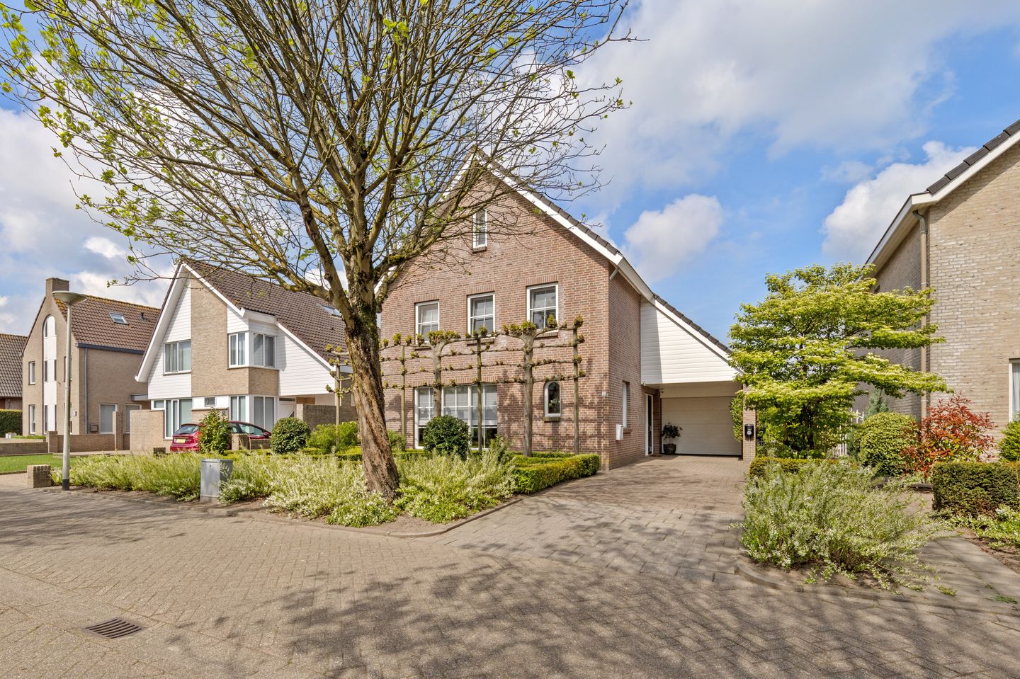 De voortuin is fraai aangelegd met een paadje links van de woning en een oprit rechts van de woning. Deze diepe voortuin vormt daarnaast een natuurlijke overgang tussen het woonhof en de woning.