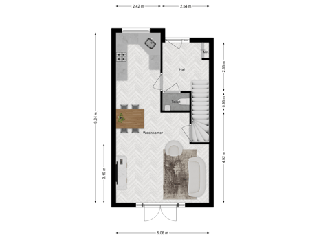 De woning verwelkomt je in een nette hal met toiletruimte, meterkast, garderobe en trapopgang. De lichte woonkamer ligt aan de achterzijde en biedt een fijn uitzicht op de tuin. Dankzij de open verbinding met de keuken ontstaat er een prettige leefruimte waar gezin en vrienden samenkomen, met voldoende ruimte voor een eet- en zitgedeelte. Een praktische bergkast in de woonkamer biedt ruimte voor opslag. De keuken is voorzien van diverse inbouwapparatuur als een vaatwasser, combi-oven, 5 pits gaskookplaat, afzuigkap en koelkast. Vanuit de keuken is er zicht op de straat.