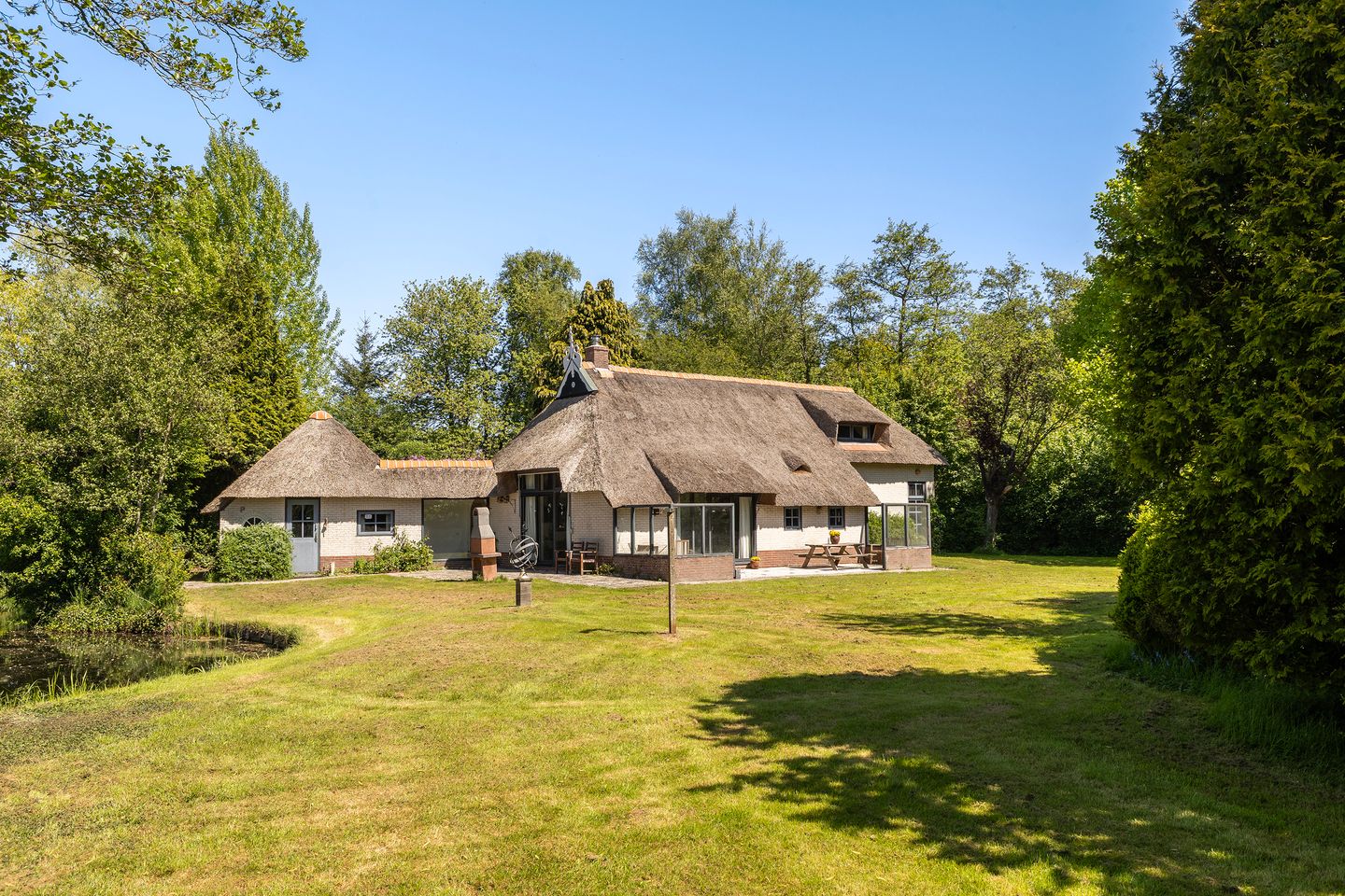Dit is fijn thuiskomen. Op een unieke locatie, verscholen in het groen staat deze vrijstaande rietgedekte woning met slaap- en badkamer voorzieningen op de begane grond, aangebouwde garage en prachtige parkachtige tuin. Het geheel staat totaal op 13.635 m² eigen grond, dus je hebt volop de ruimte in de tuin rondom de woning. Een geweldig idyllisch plekje.