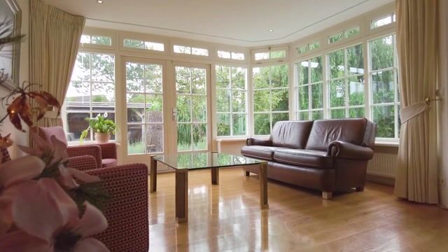Op de begane grond bevindt zich een lichte woonkamer die dankzij de vele ramen baadt in daglicht. Vanuit elke hoek heb je uitzicht op de prachtig aangelegde tuin. De zon draait de hele dag met je mee – perfect voor lange zomerdagen met familie of gewoon voor dat ene goede boek op het terras.