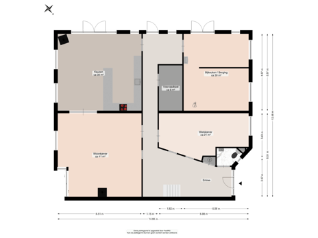 Ruime entree, toilet, gang, woonkamer, woonkeuken, werkkamer/of slaapkamer, provisiekast, bijkeuken/berging.