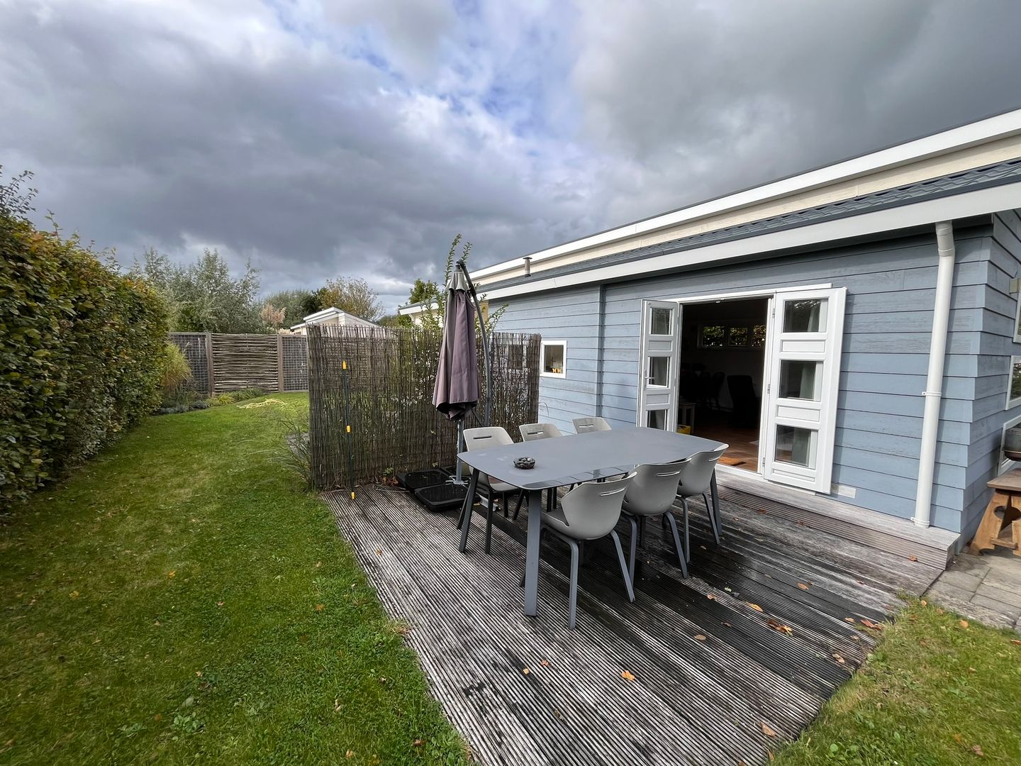 De L-vormige tuin met vlonder terras biedt veel privacy. De borders en het groen rondom is onlangs opnieuw aangelegd en vergt bijzonder weinig onderhoud. Dit onderhoud kan eventueel ook via het chaletpark verlopen. Net als het CV onderhoud en de onkruidbestrijding. Het chalet is privé -eigendom en nooit verhuurd aan derden, waardoor het chalet meteen instap-klaar is.
