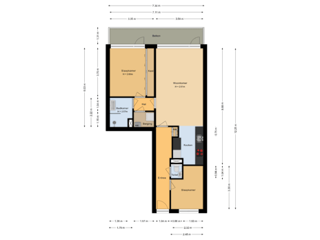 - 10 m² (1,31 meter diep en 7,30 meter breed)
