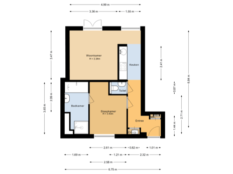 - 14 m² (2,30 meter diep en 6,16 meter breed)